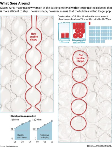Charlotte N.C.-based Sealed Air is betting iBubble Wrap will appeal to space-conscious online retailers who are driving swift growth in the global packaging business, even as fans are disappointed by the lack of pop. Traditional Bubble Wrap ships in giant, pre-inflated rolls, taking up precious room in delivery trucks and on customers’ warehouse floors. One roll of the new iBubble Wrap uses roughly one-fiftieth as much space before it’s inflated.